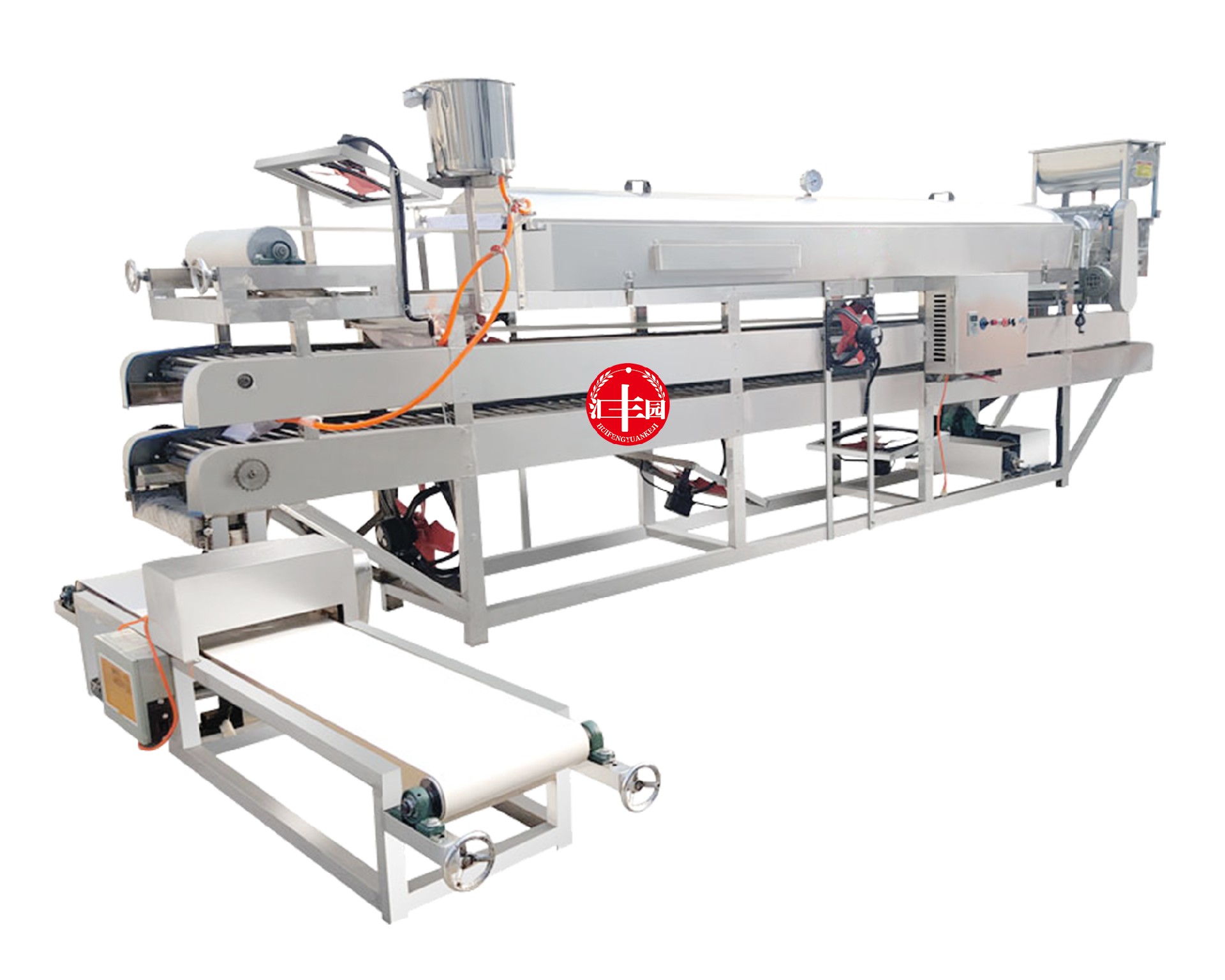 數(shù)控雙層冷卻涼皮機(jī)系全自動(dòng)型,將面漿、米漿、淀粉漿等原料加入漿桶后,可以自動(dòng)上漿,可生產(chǎn):折疊張、切條等形狀的制品,如涼皮、米皮、河粉、粉皮、米粉、大拉皮等。有時(shí)產(chǎn)200-3000斤涼皮(蒸箱長(zhǎng)度2-15米)多種型號(hào)大小的涼皮機(jī)供您選擇。本機(jī)機(jī)身及箱體采用優(yōu)質(zhì)不銹鋼制造,變頻控制、特氟龍布帶、自動(dòng)糾偏、自動(dòng)刷油、雙層傳送冷卻等操作簡(jiǎn)便,標(biāo)配電加熱,機(jī)器留有蒸氣管道,可以外接發(fā)蒸汽鍋爐等。機(jī)器切斷功能為單選產(chǎn)品,需要另購(gòu)買(mǎi)。